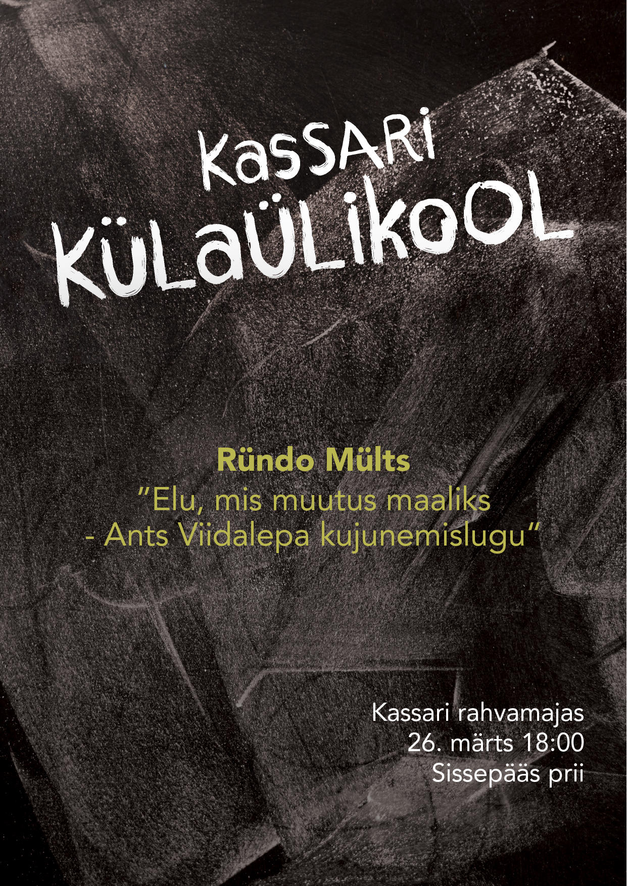 Kassari Külaülikool : ”Elu, mis muutus maaliks- Ants Viidalepa kujunemislugu” 26 märts N Kassari Külaülikool : ”Elu, mis muutus maaliks- Ants Viidalepa kujunemislugu” Kassari rahvamaja